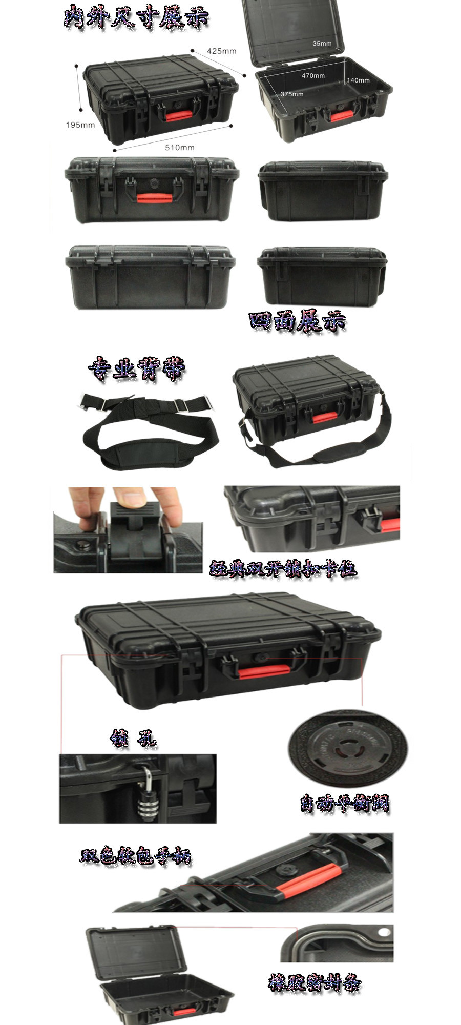 簡要說明:廣泛用于傳媒、公安、消防、軍隊、航空、戶外攝影、野外考察、科學(xué)探測等眾多領(lǐng)域的高端儀器、儀表。具有高強度、高抗壓沖擊、防潮、絕對密封、防塵、防水等特點。產(chǎn)品材質(zhì):ABS原料,箱體采用高抗沖擊的高分子聚合材料一體注塑成型,密封采用扁型彈性發(fā)泡密封橡膠條,確保防水氣密,所有較軸均采用不銹鋼材質(zhì)。