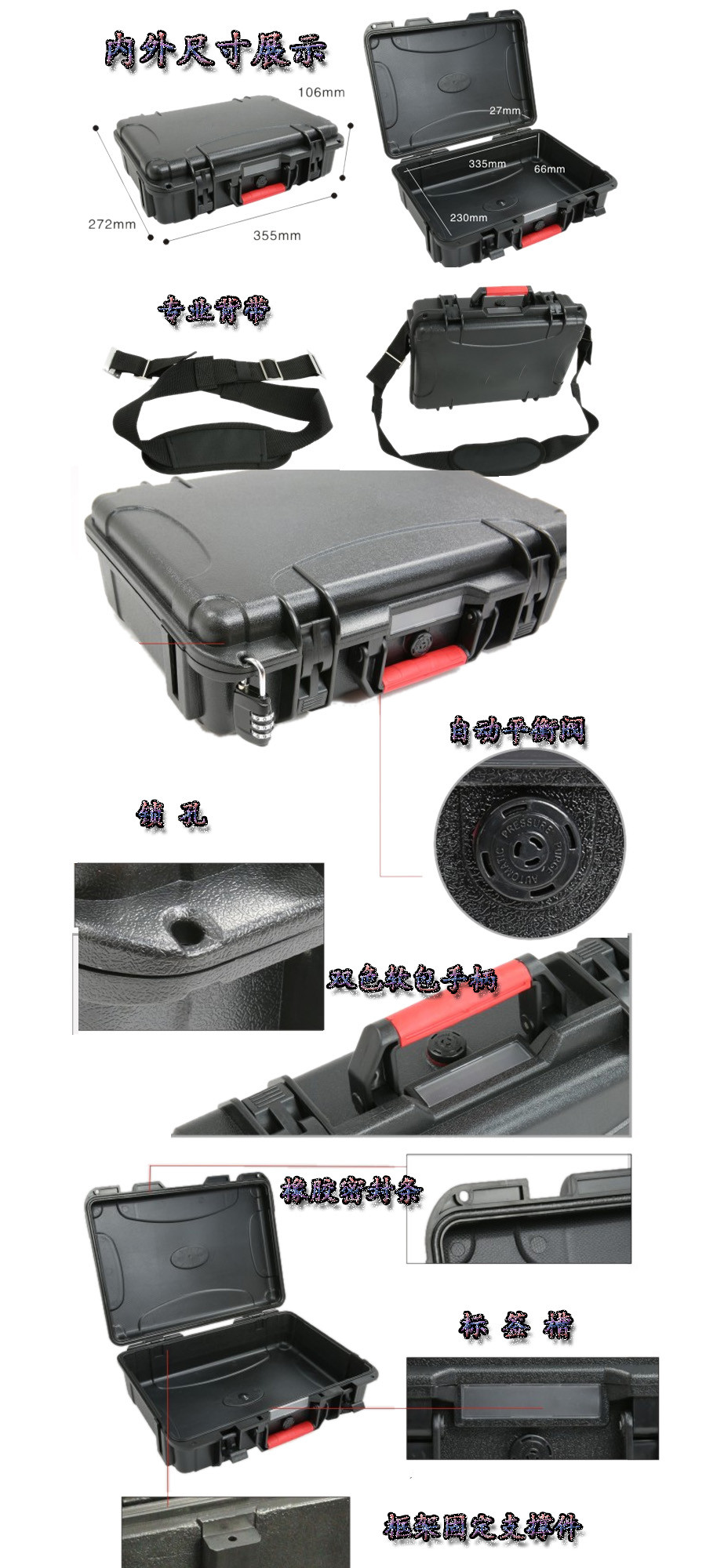 簡要說明:廣泛用于傳媒、公安、消防、軍隊、航空、戶外攝影、野外考察、科學(xué)探測等眾多領(lǐng)域的高端儀器、儀表。具有高強(qiáng)度、高抗壓沖擊、防潮、絕對密封、防塵、防水等特點。產(chǎn)品材質(zhì):ABS原料,箱體采用高抗沖擊的高分子聚合材料一體注塑成型,密封采用扁型彈性發(fā)泡密封橡膠條,確保防水氣密,所有較軸均采用不銹鋼材質(zhì)。