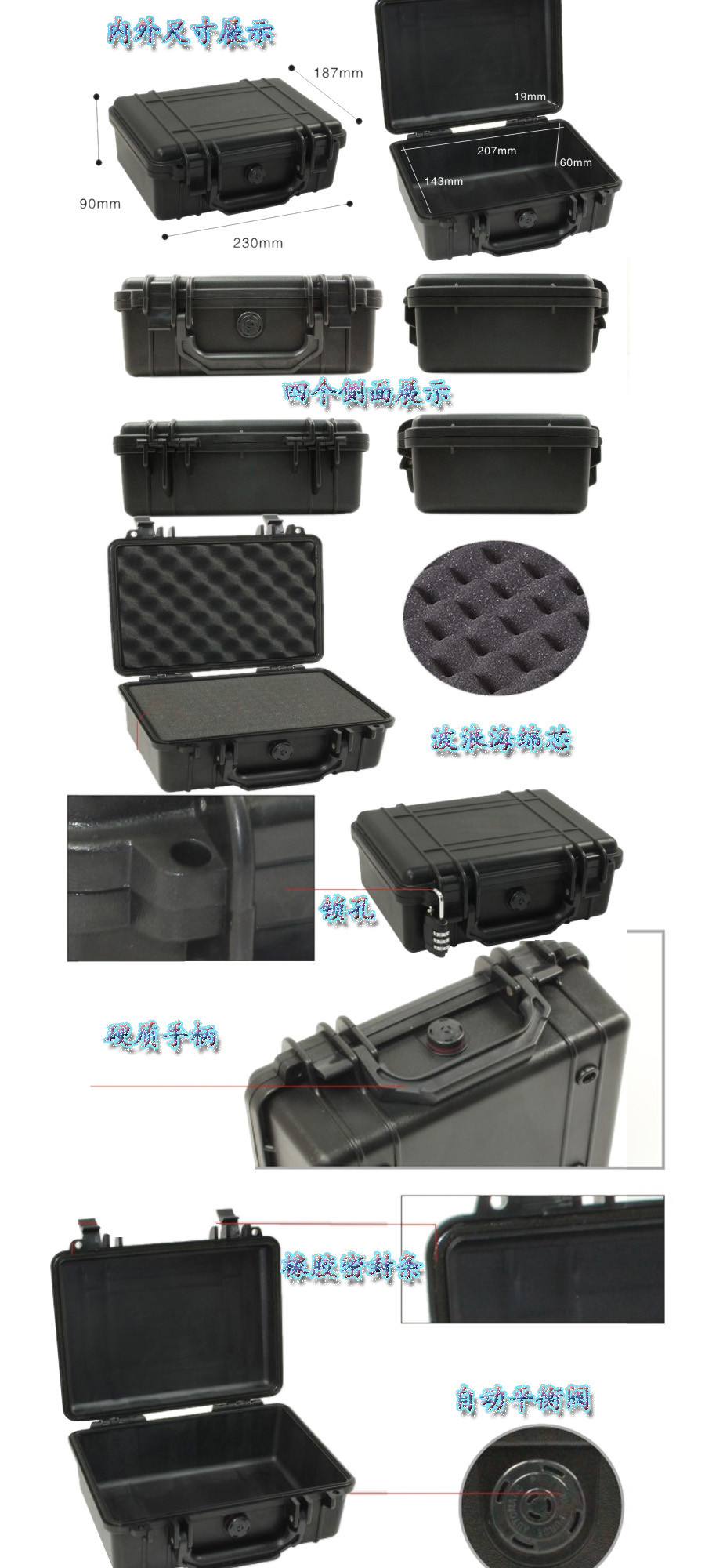 簡要說明:廣泛用于傳媒、公安、消防、軍隊(duì)、航空、戶外攝影、野外考察、科學(xué)探測等眾多領(lǐng)域的高端儀器、儀表。具有高強(qiáng)度、高抗壓沖擊、防潮、絕對密封、防塵、防水等特點(diǎn)。產(chǎn)品材質(zhì):ABS原料,箱體采用高抗沖擊的高分子聚合材料一體注塑成型,密封采用扁型彈性發(fā)泡密封橡膠條,確保防水氣密,所有較軸均采用不銹鋼材質(zhì)。