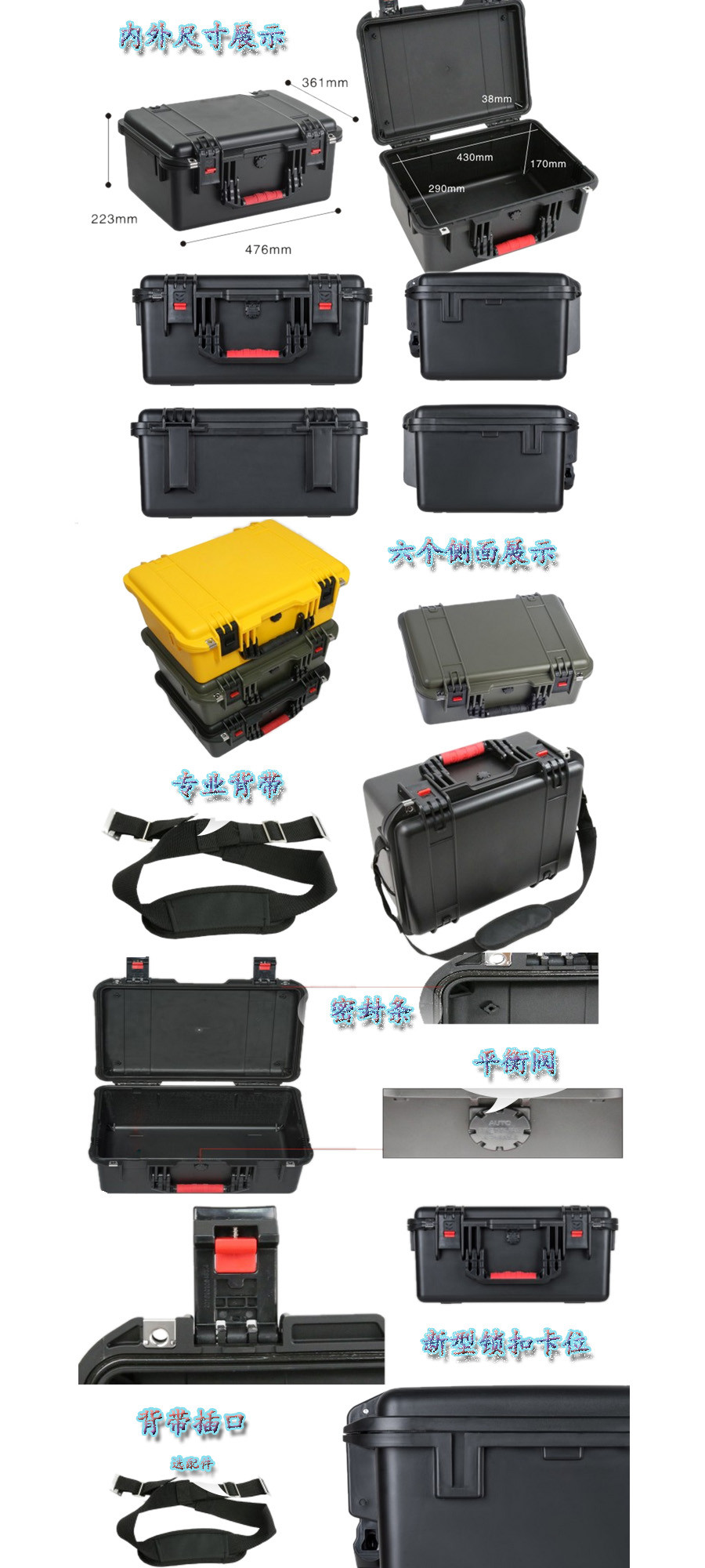 簡要說明:廣泛用于傳媒、公安、消防、軍隊(duì)、航空、戶外攝影、野外考察、科學(xué)探測等眾多領(lǐng)域的高端儀器、儀表。具有高強(qiáng)度、高抗壓沖擊、防潮、絕對密封、防塵、防水等特點(diǎn)。產(chǎn)品材質(zhì):ABS原料,箱體采用高抗沖擊的高分子聚合材料一體注塑成型,密封采用扁型彈性發(fā)泡密封橡膠條,確保防水氣密,所有較軸均采用不銹鋼材質(zhì)。