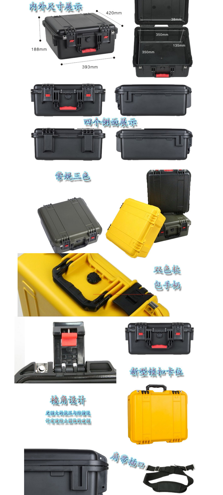 簡要說明:廣泛用于傳媒、公安、消防、軍隊、航空、戶外攝影、野外考察、科學(xué)探測等眾多領(lǐng)域的高端儀器、儀表。具有高強(qiáng)度、高抗壓沖擊、防潮、絕對密封、防塵、防水等特點(diǎn)。產(chǎn)品材質(zhì):ABS原料,箱體采用高抗沖擊的高分子聚合材料一體注塑成型,密封采用扁型彈性發(fā)泡密封橡膠條,確保防水氣密,所有較軸均采用不銹鋼材質(zhì)。