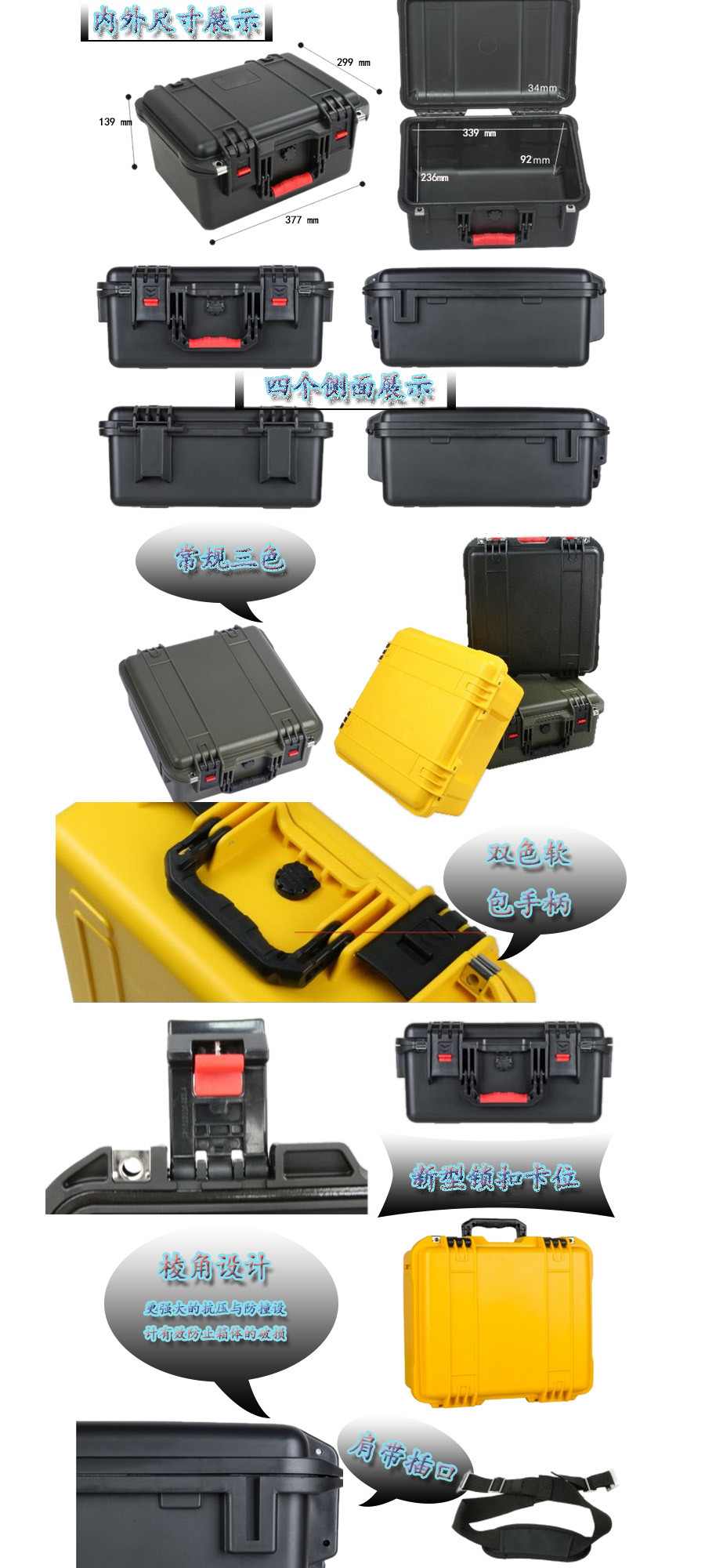 簡要說明:廣泛用于傳媒、公安、消防、軍隊(duì)、航空、戶外攝影、野外考察、科學(xué)探測等眾多領(lǐng)域的高端儀器、儀表。具有高強(qiáng)度、高抗壓沖擊、防潮、絕對密封、防塵、防水等特點(diǎn)。產(chǎn)品材質(zhì):ABS原料,箱體采用高抗沖擊的高分子聚合材料一體注塑成型,密封采用扁型彈性發(fā)泡密封橡膠條,確保防水氣密,所有較軸均采用不銹鋼材質(zhì)。
